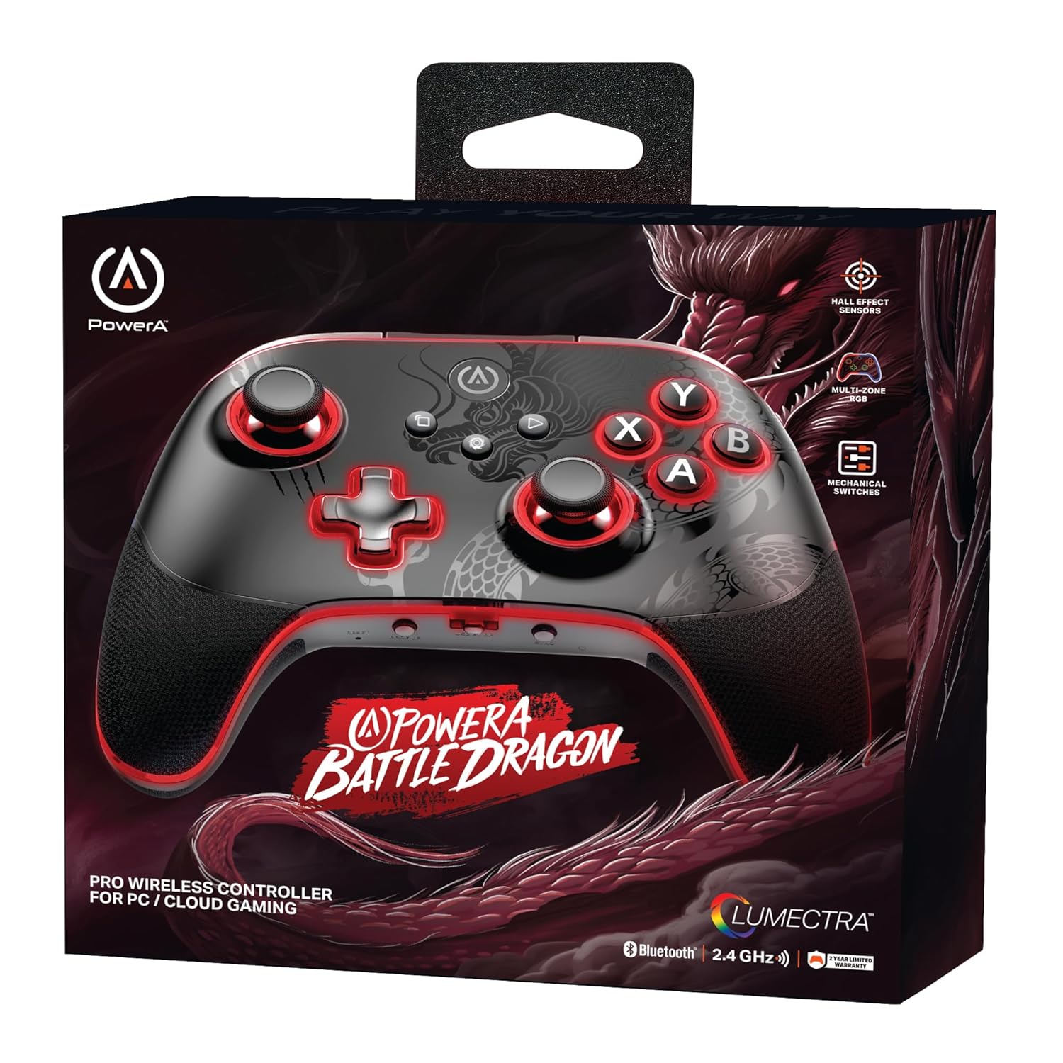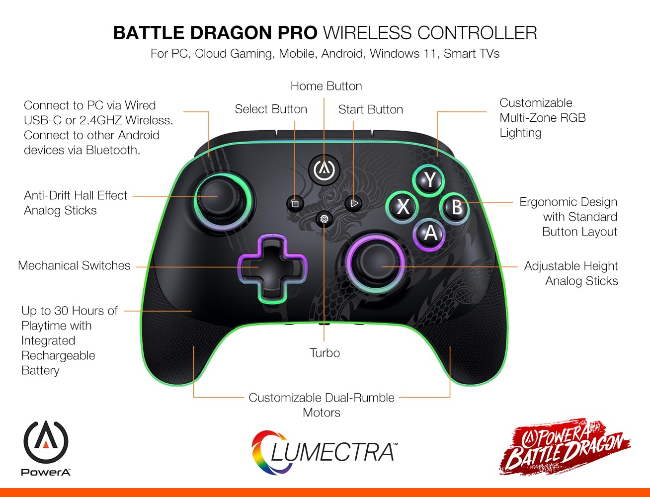 PowerA Battle Dragon™ Pro Wireless Controller with Lumectra for PC & Cloud Gaming: Magnetic Hall Effect, Asymmetric Rumble Motors, 30h Playtime (Not for iOS) - Openbox